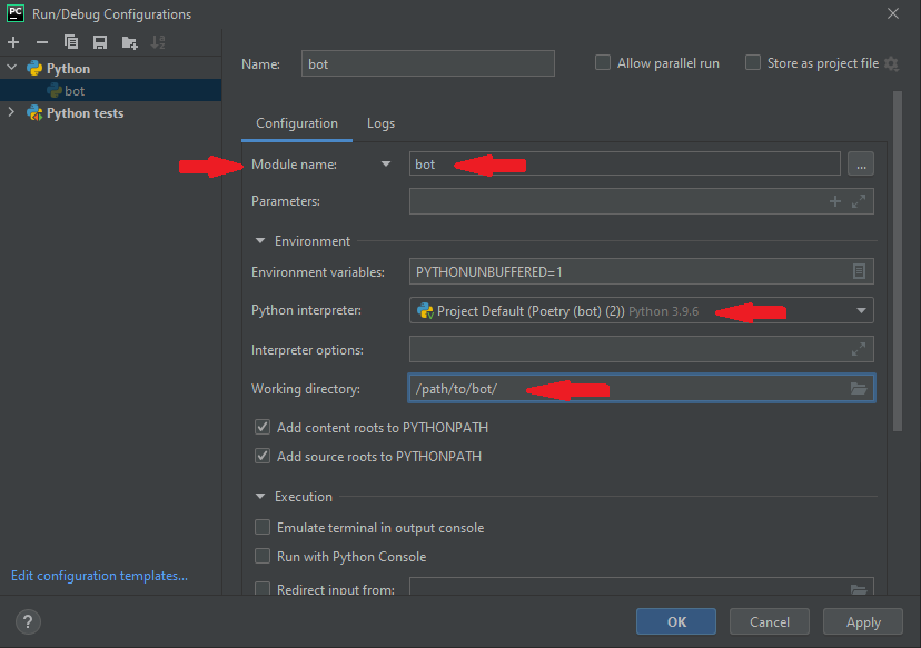 With at least the site running in Docker already (see the previous section on how to start services separately), you can now start the bot locally through the command line, or through your preferred IDE.